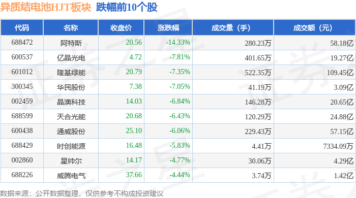 证券之星消息,11月12日异质结电池HJT板块较上一交易日下跌4.0%,阿特斯领跌。当日上证指数报收于4000.14,下跌0.07%。深证成指报收于13240.62,下跌0.36%。异质结电池HJT板块个股涨跌见下表: