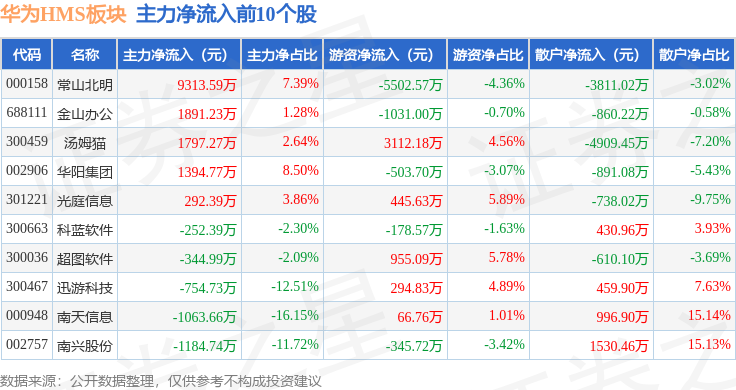 从资金流向上来看,当日华为HMS板块主力资金净流出5.76亿元,游资资金净流入6870.17万元,散户资金净流入5.08亿元。华为HMS板块个股资金流向见下表: