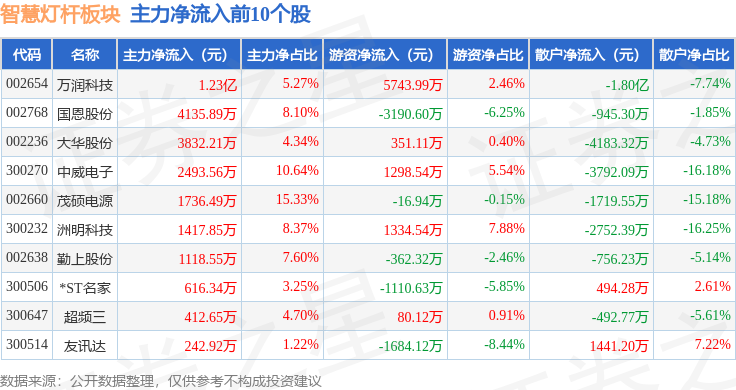 从资金流向上来看,当日智慧灯杆板块主力资金净流出5.84亿元,游资资金净流入8073.23万元,散户资金净流入5.03亿元。智慧灯杆板块个股资金流向见下表: