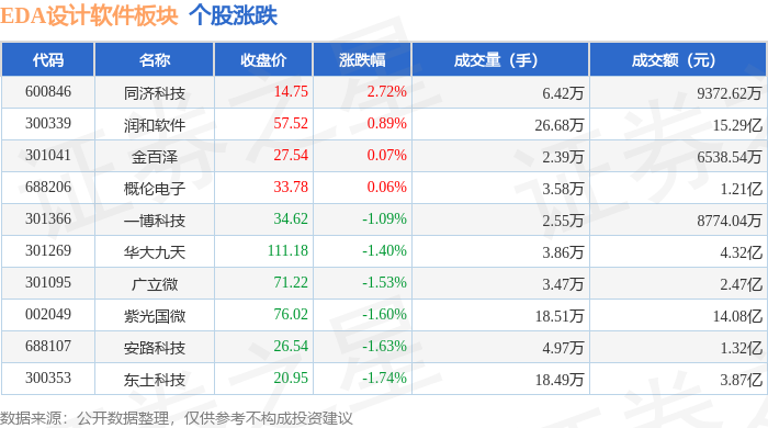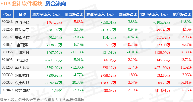 从资金流向上来看,当日EDA设计软件板块主力资金净流出3.65亿元,游资资金净流入7415.4万元,散户资金净流入2.9亿元。EDA设计软件板块个股资金流向见下表: