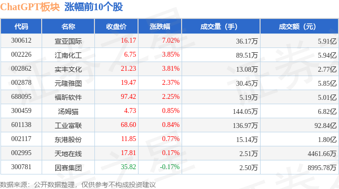 证券之星消息,11月12日ChatGPT板块较上一交易日上涨0.2%,宣亚国际领涨。当日上证指数报收于4000.14,下跌0.07%。深证成指报收于13240.62,下跌0.36%。ChatGPT板块个股涨跌见下表: