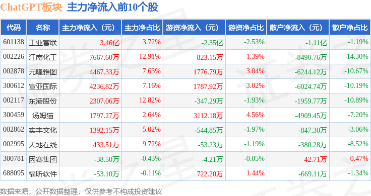 从资金流向上来看,当日ChatGPT板块主力资金净流出11.47亿元,游资资金净流入2.07亿元,散户资金净流入9.39亿元。ChatGPT板块个股资金流向见下表: