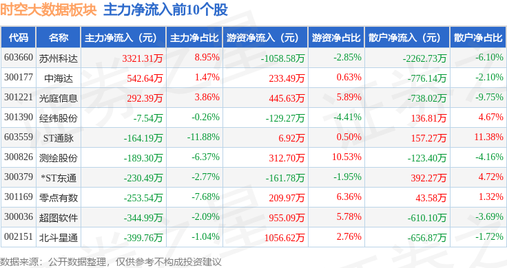 从资金流向上来看,当日时空大数据板块主力资金净流出5.32亿元,游资资金净流入7893.4万元,散户资金净流入4.53亿元。时空大数据板块个股资金流向见下表: