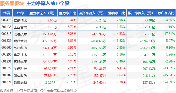 从资金流向上来看,当日服务器板块主力资金净流出17.2亿元,游资资金净流出4.31亿元,散户资金净流入21.51亿元。服务器板块个股资金流向见下表: