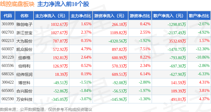从资金流向上来看,当日线控底盘板块主力资金净流出5051.7万元,游资资金净流入3628.22万元,散户资金净流入1423.47万元。线控底盘板块个股资金流向见下表: