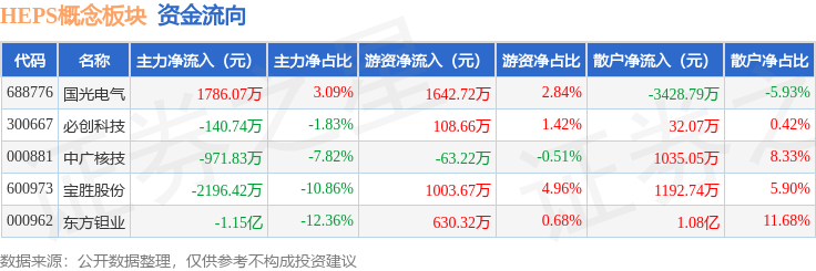 从资金流向上来看,当日HEPS概念板块主力资金净流出1.3亿元,游资资金净流入3322.15万元,散户资金净流入9663.27万元。HEPS概念板块个股资金流向见下表: