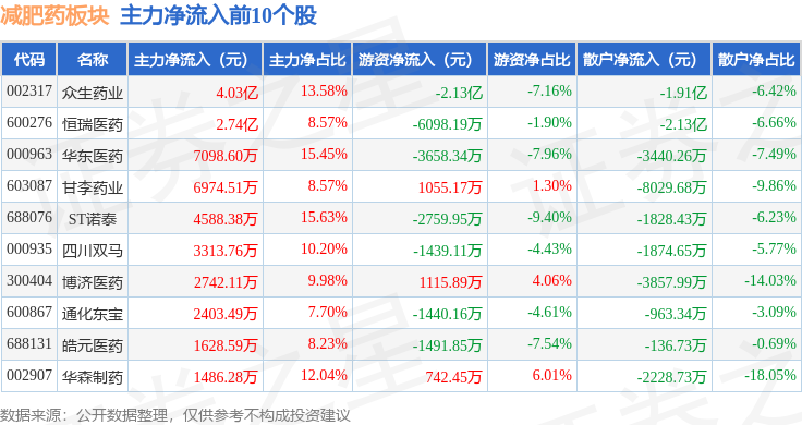从资金流向上来看,当日减肥药板块主力资金净流入6.82亿元,游资资金净流出1.38亿元,散户资金净流出5.44亿元。减肥药板块个股资金流向见下表: