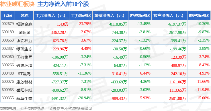 从资金流向上来看,当日林业碳汇板块主力资金净流入8575.66万元,游资资金净流出7265.86万元,散户资金净流出1309.8万元。林业碳汇板块个股资金流向见下表: