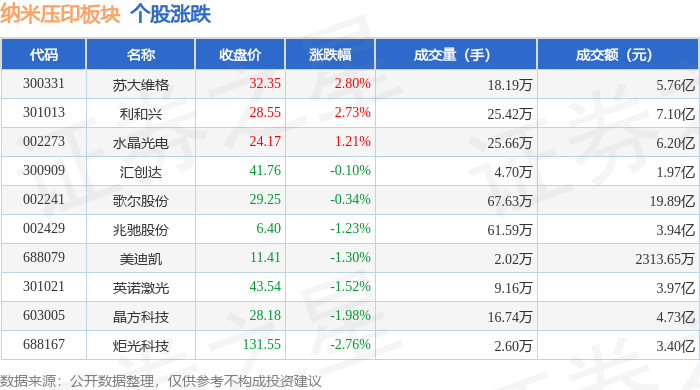 证券之星消息,11月12日纳米压印板块较上一交易日下跌0.61%,炬光科技领跌。当日上证指数报收于4000.14,下跌0.07%。深证成指报收于13240.62,下跌0.36%。纳米压印板块个股涨跌见下表: