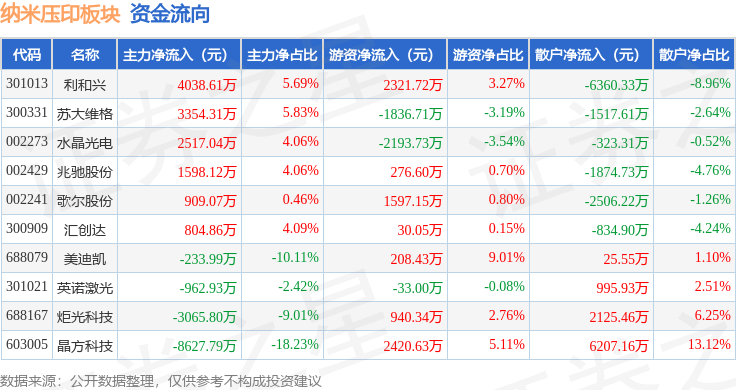 从资金流向上来看,当日纳米压印板块主力资金净流入331.51万元,游资资金净流入3731.5万元,散户资金净流出4063.01万元。纳米压印板块个股资金流向见下表: