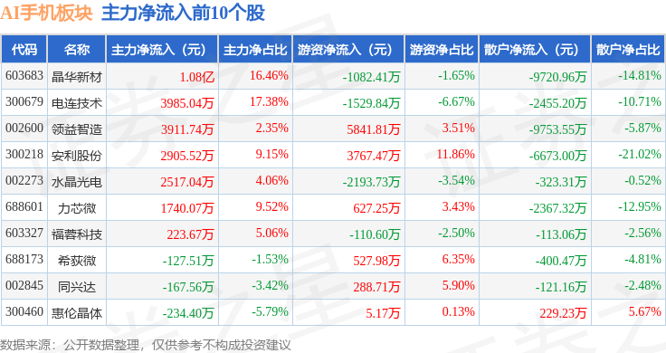 从资金流向上来看,当日AI手机板块主力资金净流出22.95亿元,游资资金净流入7.11亿元,散户资金净流入15.84亿元。AI手机板块个股资金流向见下表: