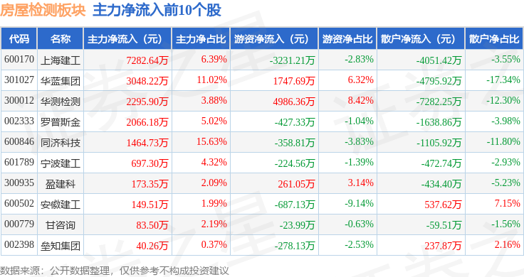 从资金流向上来看,当日房屋检测板块主力资金净流入3207.64万元,游资资金净流入4158.04万元,散户资金净流出7365.68万元。房屋检测板块个股资金流向见下表: