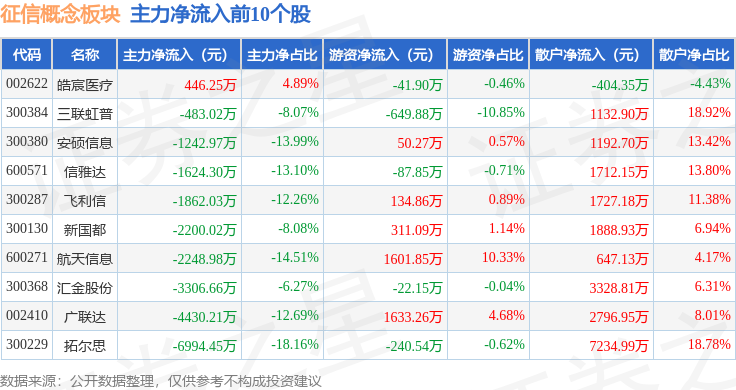 从资金流向上来看,当日征信概念板块主力资金净流出5.2亿元,游资资金净流入2698.15万元,散户资金净流入4.93亿元。征信概念板块个股资金流向见下表: