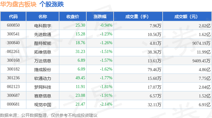 证券之星消息,11月12日华为盘古板块较上一交易日下跌1.61%,视觉中国领跌。当日上证指数报收于4000.14,下跌0.07%。深证成指报收于13240.62,下跌0.36%。华为盘古板块个股涨跌见下表: