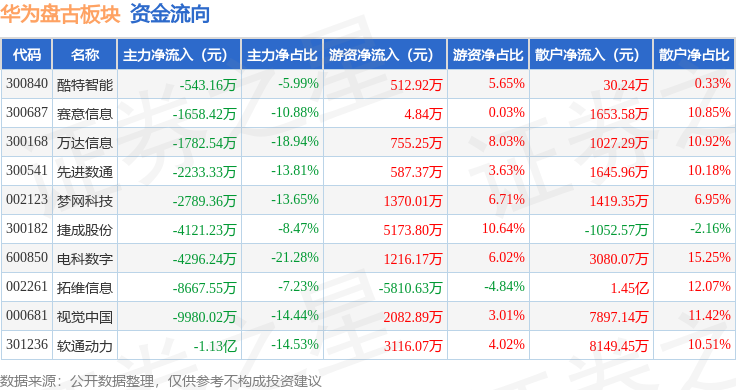 从资金流向上来看,当日华为盘古板块主力资金净流出4.73亿元,游资资金净流入9008.67万元,散户资金净流入3.83亿元。华为盘古板块个股资金流向见下表: