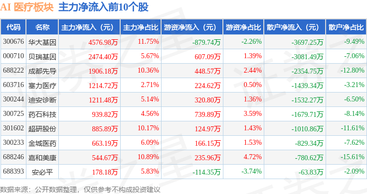 从资金流向上来看,当日AI 医疗板块主力资金净流出8565.64万元,游资资金净流入8431.82万元,散户资金净流入133.82万元。AI 医疗板块个股资金流向见下表: