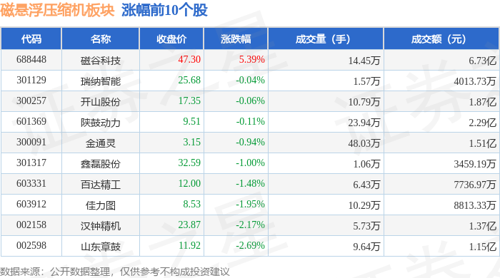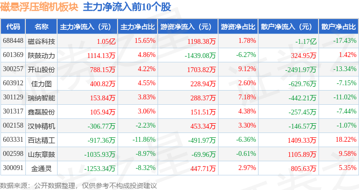 从资金流向上来看,当日磁悬浮压缩机板块主力资金净流出1.4亿元,游资资金净流入7428.38万元,散户资金净流入6563.98万元。磁悬浮压缩机板块个股资金流向见下表: