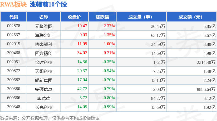 从资金流向上来看,当日RWA板块主力资金净流出2.81亿元,游资资金净流入5408.46万元,散户资金净流入2.27亿元。RWA板块个股资金流向见下表:
