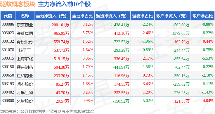 从资金流向上来看,当日驱蚊概念板块主力资金净流出1.51亿元,游资资金净流入5504.22万元,散户资金净流入9629.83万元。驱蚊概念板块个股资金流向见下表: