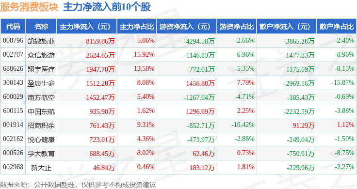 从资金流向上来看,当日服务消费板块主力资金净流出7.35亿元,游资资金净流入1.0亿元,散户资金净流入6.35亿元。服务消费板块个股资金流向见下表: