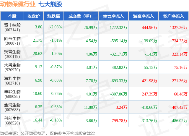 个股表现方面,动物保健行业当日领跌股为贤丰控股(002141),该股当日报收3.8,下跌2.06%,成交量26.99万,主力资金净流出1772.32万元。回盛生物(300871)以下跌1.81%紧随其后,该股当日成交量4.54万,主力资金净流出595.14万元。除此之外,瑞普生物(300119)、大禹生物(920970)、海利生物(603718)均进入当日熊股之列。具体个股列表见下表: