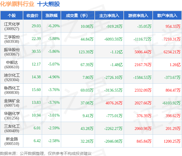 个股表现方面,化学原料行业当日领跌股为江天化学(300927),该股当日报收29.03,下跌6.2%,成交量10.08万,主力资金净流出919.28万元。三孚股份(603938)以下跌5.88%紧随其后,该股当日成交量44.84万,主力资金净流出6093.59万元。除此之外,振华股份(603067)、中毅达(600610)、迪尔化工(920304)均进入当日熊股之列。具体个股列表见下表: