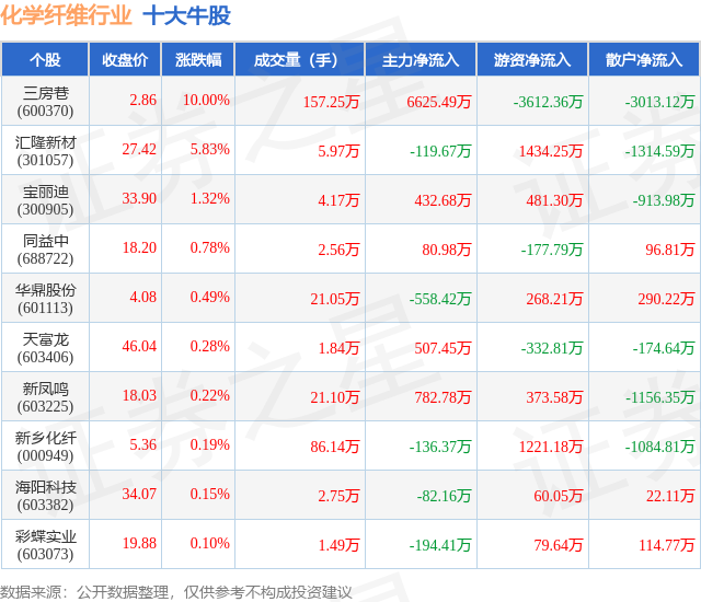 个股表现方面,化学纤维行业当日领涨股为三房巷(600370),该股当日报收2.86,上涨10.0%,成交量157.25万,主力资金净流入6625.49万元。汇隆新材(301057)以上涨5.83%紧随其后,该股当日成交量5.97万,主力资金净流出119.67万元。除此之外,宝丽迪(300905)、同益中(688722)、华鼎股份(601113)均进入当日牛股之列。具体个股列表见下表: