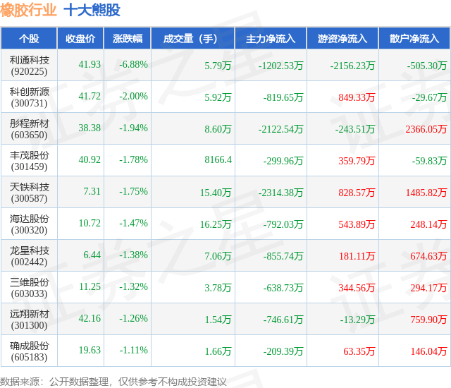 个股表现方面,橡胶行业当日领跌股为利通科技(920225),该股当日报收41.93,下跌6.88%,成交量5.79万,主力资金净流出1202.53万元。科创新源(300731)以下跌2.0%紧随其后,该股当日成交量5.92万,主力资金净流出819.65万元。除此之外,彤程新材(603650)、丰茂股份(301459)、天铁科技(300587)均进入当日熊股之列。具体个股列表见下表: