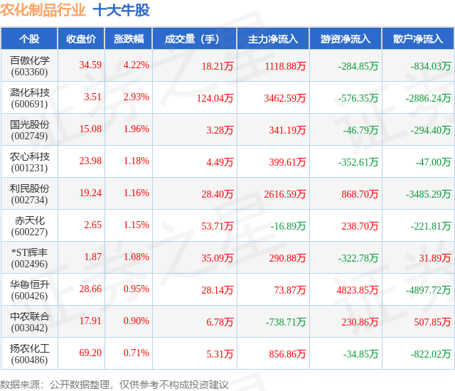 个股表现方面,农化制品行业当日领涨股为百傲化学(603360),该股当日报收34.59,上涨4.22%,成交量18.21万,主力资金净流入1118.88万元。潞化科技(600691)以上涨2.93%紧随其后,该股当日成交量124.04万,主力资金净流入3462.59万元。除此之外,国光股份(002749)、农心科技(001231)、利民股份(002734)均进入当日牛股之列。具体个股列表见下表: