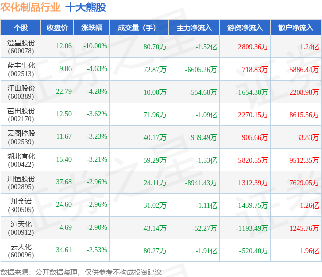 个股表现方面,农化制品行业当日领跌股为澄星股份(600078),该股当日报收12.06,下跌10.0%,成交量80.7万,主力资金净流出1.52亿元。蓝丰生化(002513)以下跌4.63%紧随其后,该股当日成交量72.87万,主力资金净流出6605.26万元。除此之外,江山股份(600389)、芭田股份(002170)、云图控股(002539)均进入当日熊股之列。具体个股列表见下表:
