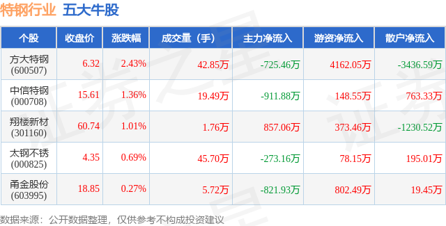 个股表现方面,特钢行业当日领涨股为方大特钢(600507),该股当日报收6.32,上涨2.43%,成交量42.85万,主力资金净流出725.46万元。中信特钢(000708)以上涨1.36%紧随其后,该股当日成交量19.49万,主力资金净流出911.88万元。除此之外,翔楼新材(301160)、太钢不锈(000825)、甬金股份(603995)均进入当日牛股之列。具体个股列表见下表: