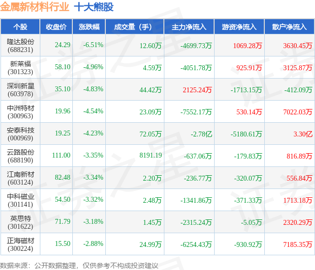 个股表现方面,金属新材料行业当日领跌股为隆达股份(688231),该股当日报收24.29,下跌6.51%,成交量12.6万,主力资金净流出4699.73万元。新莱福(301323)以下跌4.96%紧随其后,该股当日成交量4.59万,主力资金净流出4051.78万元。除此之外,深圳新星(603978)、中洲特材(300963)、安泰科技(000969)均进入当日熊股之列。具体个股列表见下表: