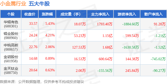 个股表现方面,小金属行业当日领涨股为华锡有色(600301),该股当日报收33.57,上涨5.43%,成交量18.07万,主力资金净流入1793.4万元。锡业股份(000960)以上涨4.21%紧随其后,该股当日成交量53.23万,主力资金净流入1.15亿元。除此之外,中钨高新(000657)、金钼股份(601958)、金天钛业(688750)均进入当日牛股之列。具体个股列表见下表: