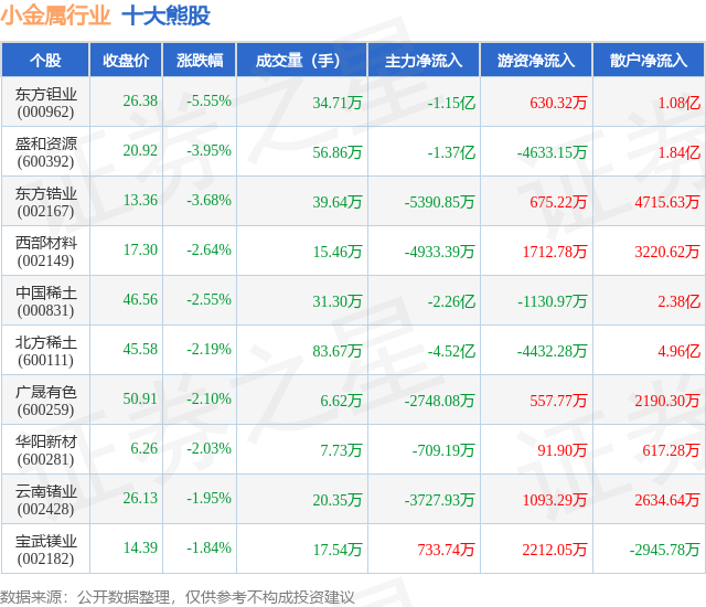 个股表现方面,小金属行业当日领跌股为东方钽业(000962),该股当日报收26.38,下跌5.55%,成交量34.71万,主力资金净流出1.15亿元。盛和资源(600392)以下跌3.95%紧随其后,该股当日成交量56.86万,主力资金净流出1.37亿元。除此之外,东方锆业(002167)、西部材料(002149)、中国稀土(000831)均进入当日熊股之列。具体个股列表见下表: