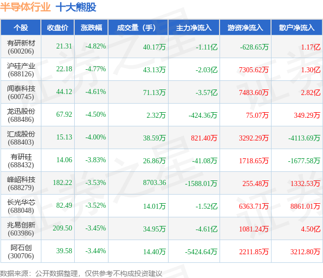 个股表现方面,半导体行业当日领跌股为有研新材(600206),该股当日报收21.31,下跌4.82%,成交量40.17万,主力资金净流出1.11亿元。沪硅产业(688126)以下跌4.77%紧随其后,该股当日成交量43.13万,主力资金净流出2.03亿元。除此之外,闻泰科技(600745)、龙迅股份(688486)、汇成股份(688403)均进入当日熊股之列。具体个股列表见下表: