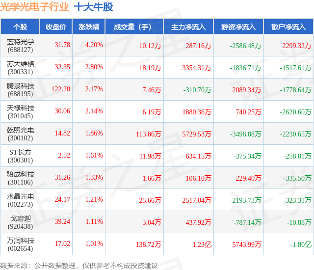 个股表现方面,光学光电子行业当日领涨股为蓝特光学(688127),该股当日报收31.78,上涨4.2%,成交量10.12万,主力资金净流入287.16万元。苏大维格(300331)以上涨2.8%紧随其后,该股当日成交量18.19万,主力资金净流入3354.31万元。除此之外,腾景科技(688195)、天禄科技(301045)、乾照光电(300102)均进入当日牛股之列。具体个股列表见下表: