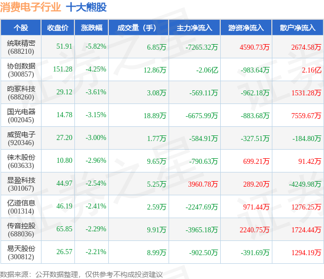 个股表现方面,消费电子行业当日领跌股为统联精密(688210),该股当日报收51.91,下跌5.82%,成交量6.85万,主力资金净流出7265.32万元。协创数据(300857)以下跌4.25%紧随其后,该股当日成交量12.86万,主力资金净流出2.06亿元。除此之外,昀冢科技(688260)、国光电器(002045)、威贸电子(920346)均进入当日熊股之列。具体个股列表见下表: