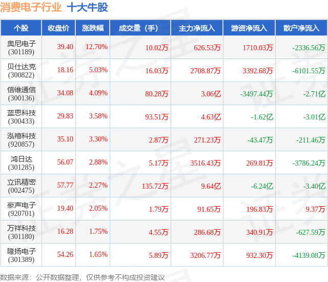 个股表现方面,消费电子行业当日领涨股为奥尼电子(301189),该股当日报收39.4,上涨12.7%,成交量10.02万,主力资金净流入626.53万元。贝仕达克(300822)以上涨5.03%紧随其后,该股当日成交量16.03万,主力资金净流入2708.87万元。除此之外,信维通信(300136)、蓝思科技(300433)、泓禧科技(920857)均进入当日牛股之列。具体个股列表见下表:
