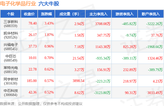 个股表现方面,电子化学品行业当日领涨股为三孚新科(688359),该股当日报收78.4,上涨3.43%,成交量2.94万,主力资金净流入3708.08万元。凯华材料(920526)以上涨1.87%紧随其后,该股当日成交量1.58万,主力资金净流入347.75万元。除此之外,兴福电子(688545)、中巨芯(688549)、莱特光电(688150)均进入当日牛股之列。具体个股列表见下表: