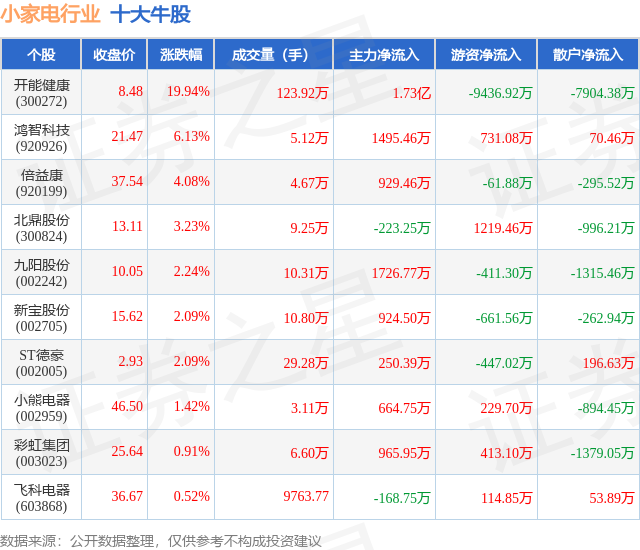 个股表现方面,小家电行业当日领涨股为开能健康(300272),该股当日报收8.48,上涨19.94%,成交量123.92万,主力资金净流入1.73亿元。鸿智科技(920926)以上涨6.13%紧随其后,该股当日成交量5.12万,主力资金净流入1495.46万元。除此之外,倍益康(920199)、北鼎股份(300824)、九阳股份(002242)均进入当日牛股之列。具体个股列表见下表: