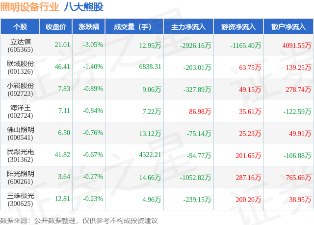 个股表现方面,照明设备行业当日领跌股为立达信(605365),该股当日报收21.01,下跌3.05%,成交量12.95万,主力资金净流出2926.16万元。联域股份(001326)以下跌1.4%紧随其后,该股当日成交量6838.0,主力资金净流出203.01万元。除此之外,小崧股份(002723)、海洋王(002724)、佛山照明(000541)均进入当日熊股之列。具体个股列表见下表: