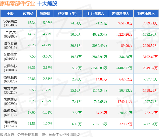 个股表现方面,家电零部件行业当日领跌股为汉宇集团(300403),该股当日报收15.34,下跌5.95%,成交量74.31万,主力资金净流出1.22亿元。星帅尔(002860)以下跌4.77%紧随其后,该股当日成交量30.06万,主力资金净流出4632.3万元。除此之外,海立股份(600619)、东贝集团(601956)、宏昌科技(301008)均进入当日熊股之列。具体个股列表见下表: