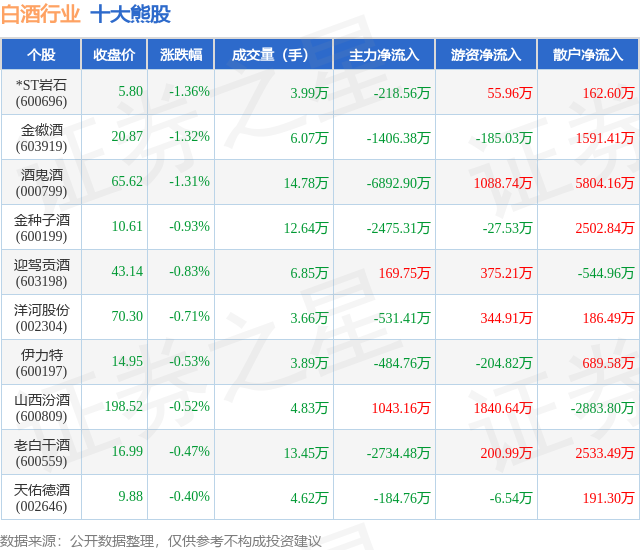 个股表现方面,白酒行业当日领跌股为*ST岩石(600696),该股当日报收5.8,下跌1.36%,成交量3.99万,主力资金净流出218.56万元。金徽酒(603919)以下跌1.32%紧随其后,该股当日成交量6.07万,主力资金净流出1406.38万元。除此之外,酒鬼酒(000799)、金种子酒(600199)、迎驾贡酒(603198)均进入当日熊股之列。具体个股列表见下表: