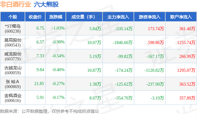 个股表现方面,非白酒行业当日领跌股为*ST椰岛(600238),该股当日报收6.75,下跌1.03%,成交量5.84万,主力资金净流出535.14万元。莫高股份(600543)以下跌0.9%紧随其后,该股当日成交量10.07万,主力资金净流出1846.6万元。除此之外,威龙股份(603779)、古越龙山(600059)、张 裕A(000869)均进入当日熊股之列。具体个股列表见下表: