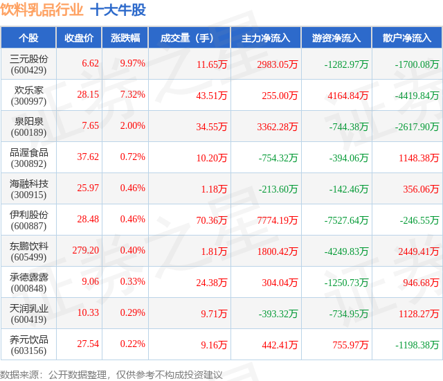 个股表现方面,饮料乳品行业当日领涨股为三元股份(600429),该股当日报收6.62,上涨9.97%,成交量11.65万,主力资金净流入2983.05万元。欢乐家(300997)以上涨7.32%紧随其后,该股当日成交量43.51万,主力资金净流入255.0万元。除此之外,泉阳泉(600189)、品渥食品(300892)、海融科技(300915)均进入当日牛股之列。具体个股列表见下表: