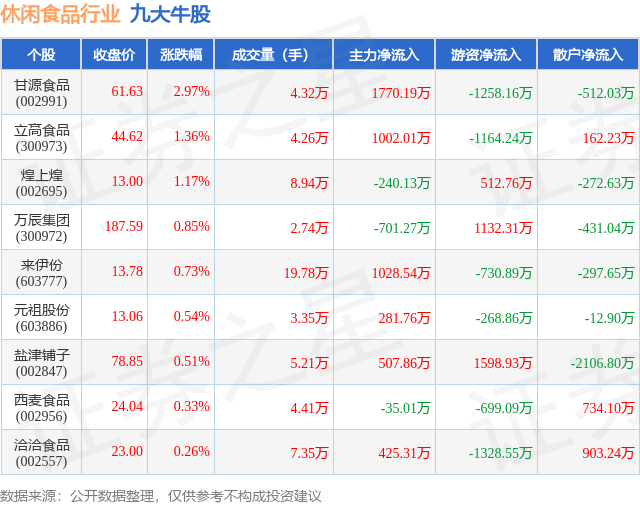 个股表现方面,休闲食品行业当日领涨股为甘源食品(002991),该股当日报收61.63,上涨2.97%,成交量4.32万,主力资金净流入1770.19万元。立高食品(300973)以上涨1.36%紧随其后,该股当日成交量4.26万,主力资金净流入1002.01万元。除此之外,煌上煌(002695)、万辰集团(300972)、来伊份(603777)均进入当日牛股之列。具体个股列表见下表: