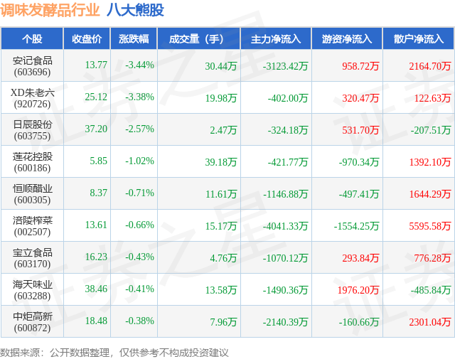 个股表现方面,调味发酵品行业当日领跌股为安记食品(603696),该股当日报收13.77,下跌3.44%,成交量30.44万,主力资金净流出3123.42万元。XD朱老六(920726)以下跌3.38%紧随其后,该股当日成交量19.98万,主力资金净流出402.0万元。除此之外,日辰股份(603755)、莲花控股(600186)、恒顺醋业(600305)均进入当日熊股之列。具体个股列表见下表: