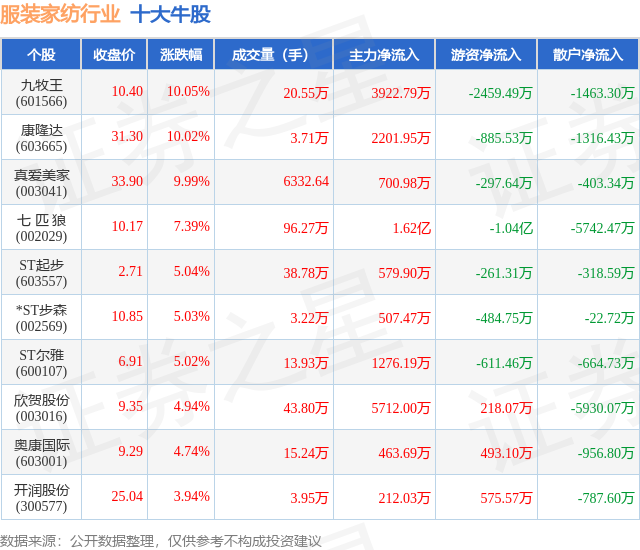 个股表现方面,服装家纺行业当日领涨股为九牧王(601566),该股当日报收10.4,上涨10.05%,成交量20.55万,主力资金净流入3922.79万元。康隆达(603665)以上涨10.02%紧随其后,该股当日成交量3.71万,主力资金净流入2201.95万元。除此之外,真爱美家(003041)、七 匹 狼(002029)、ST起步(603557)均进入当日牛股之列。具体个股列表见下表: