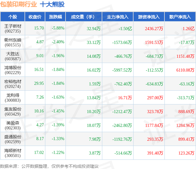个股表现方面,包装印刷行业当日领跌股为王子新材(002735),该股当日报收15.7,下跌5.88%,成交量32.94万,主力资金净流出1.5亿元。衢州东峰(601515)以下跌2.4%紧随其后,该股当日成交量33.12万,主力资金净流出1573.66万元。除此之外,大胜达(603687)、鸿博股份(002229)、宏裕包材(920274)均进入当日熊股之列。具体个股列表见下表: