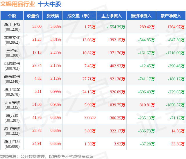 个股表现方面,文娱用品行业当日领涨股为浙江正特(001238),该股当日报收53.0,上涨5.68%,成交量1.75万,主力资金净流出1554.39万元。实丰文化(002862)以上涨3.81%紧随其后,该股当日成交量13.08万,主力资金净流入1392.15万元。除此之外,三柏硕(001300)、创源股份(300703)、高乐股份(002348)均进入当日牛股之列。具体个股列表见下表: